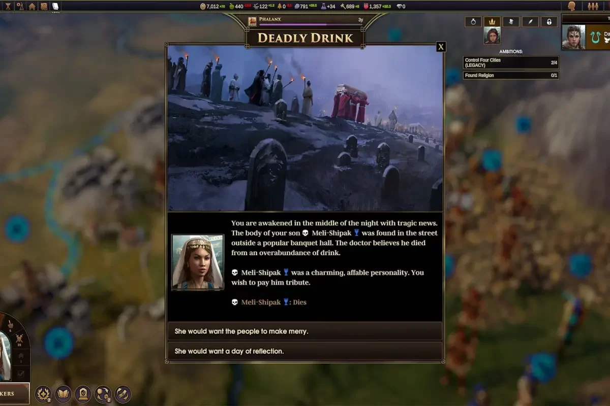 • Престолонаследие. Каждый ход в игре Old World — это год жизни правителя. И каждый год на счету, ведь все правители смертны. Нужно успеть обзавестись семьёй и воспитать преемника, чтобы тот унаследовал престол. А когда правитель покинет этот мир, вступивший на трон наследник выберет новую амбицию, чтобы заявить о себе.