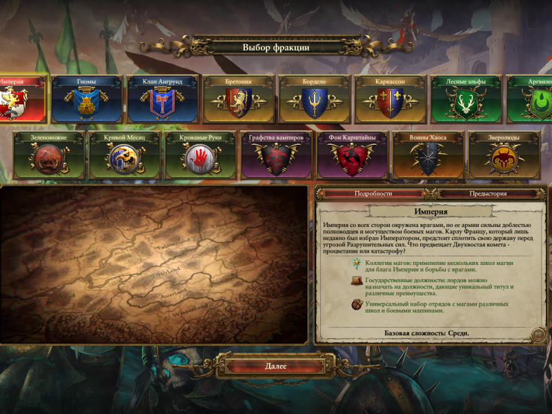 В этой игре вы сможете возглавить любую из пяти уникальных рас: Бретонию, Империю, гномов, зеленокожих и графов вампиров. Для каждой из них предусмотрены собственные персонажи, войска и особенности игровой механики.